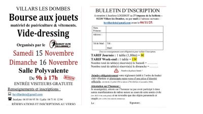 L’association du basket club villardois organise une bourse aux jouets les samedi 15 et dimanche 16 novembre à la salle polyvalente de 9h à 17h.