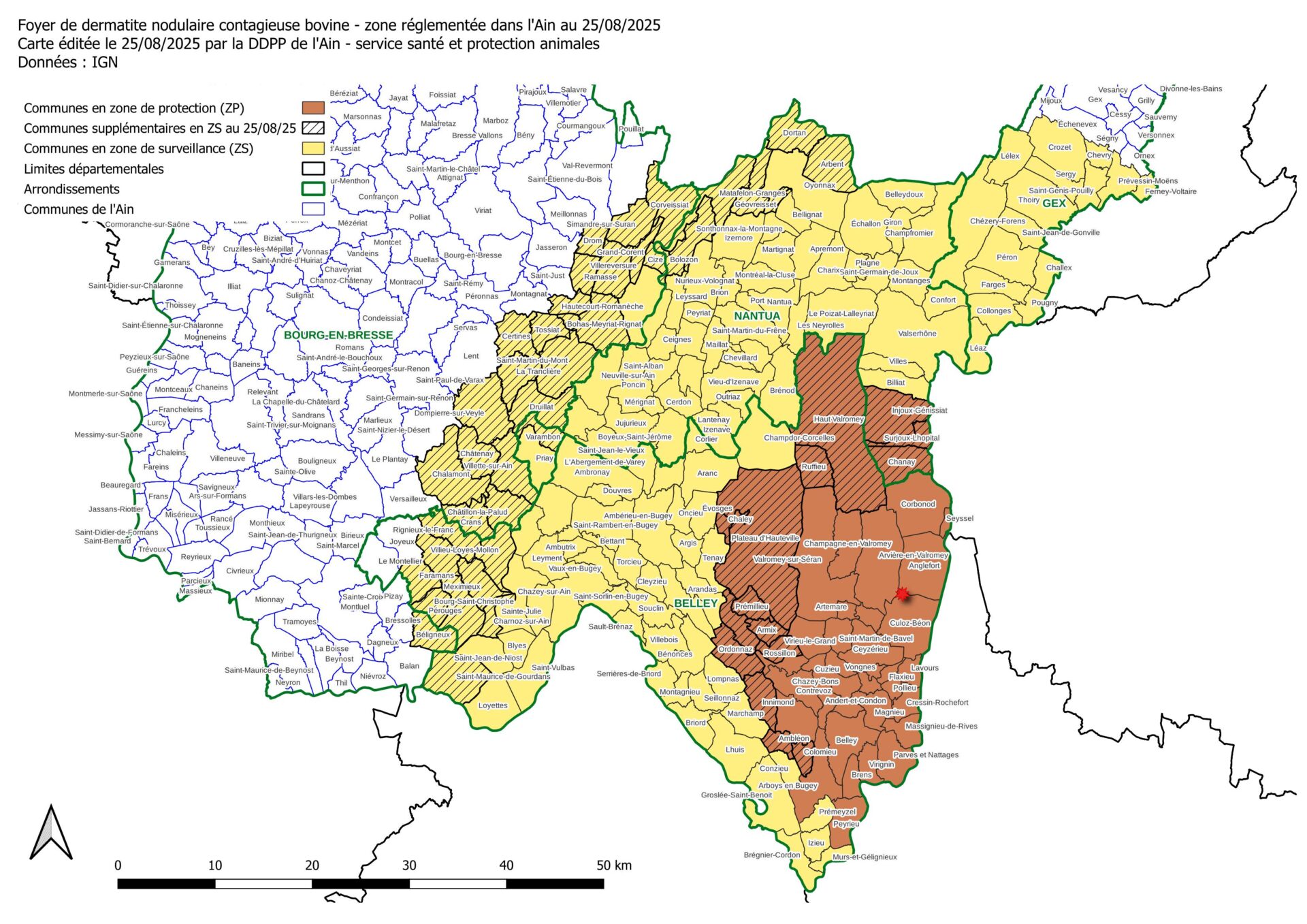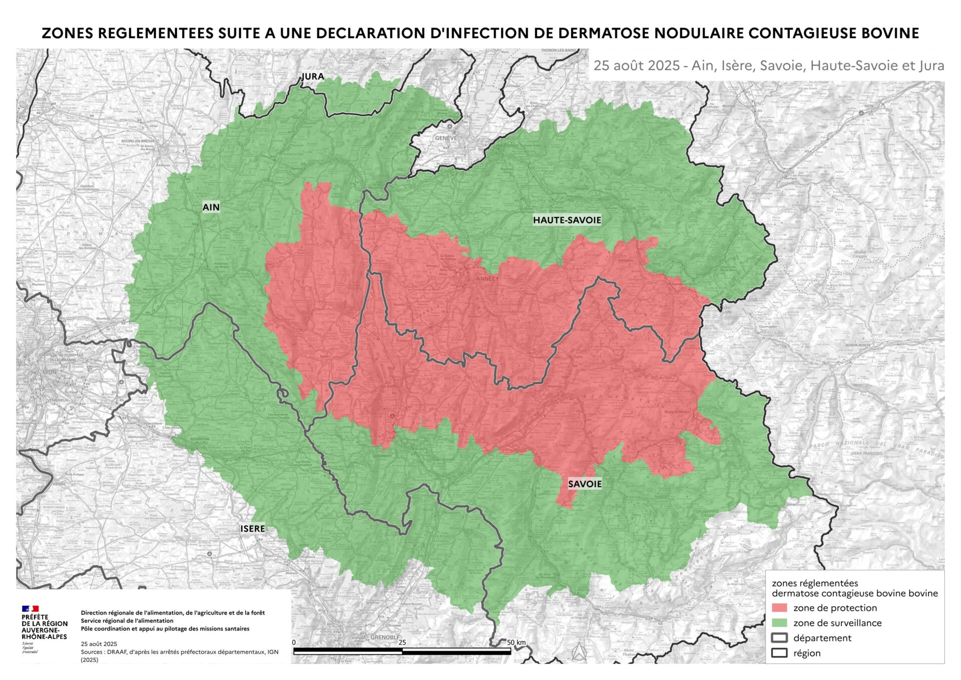 Arrêté déterminant une zone reglementée suite au foyer de dermatose nodulaire contagieuse bovine zones reglementées